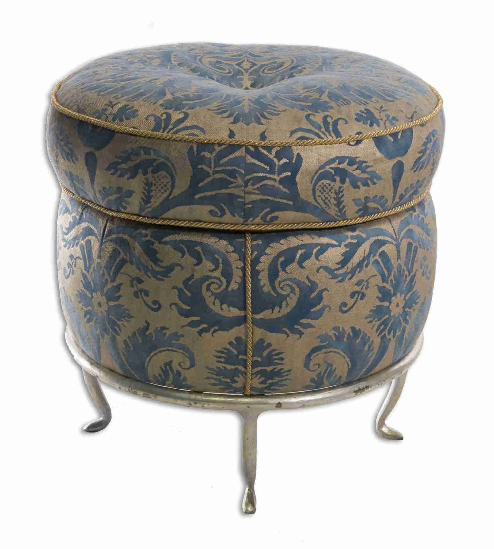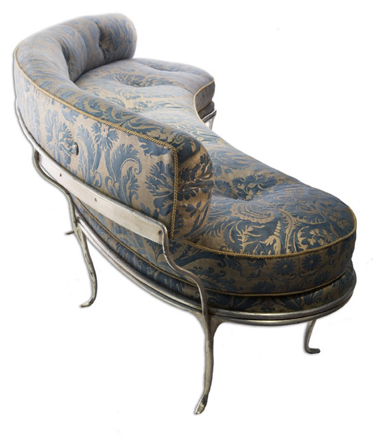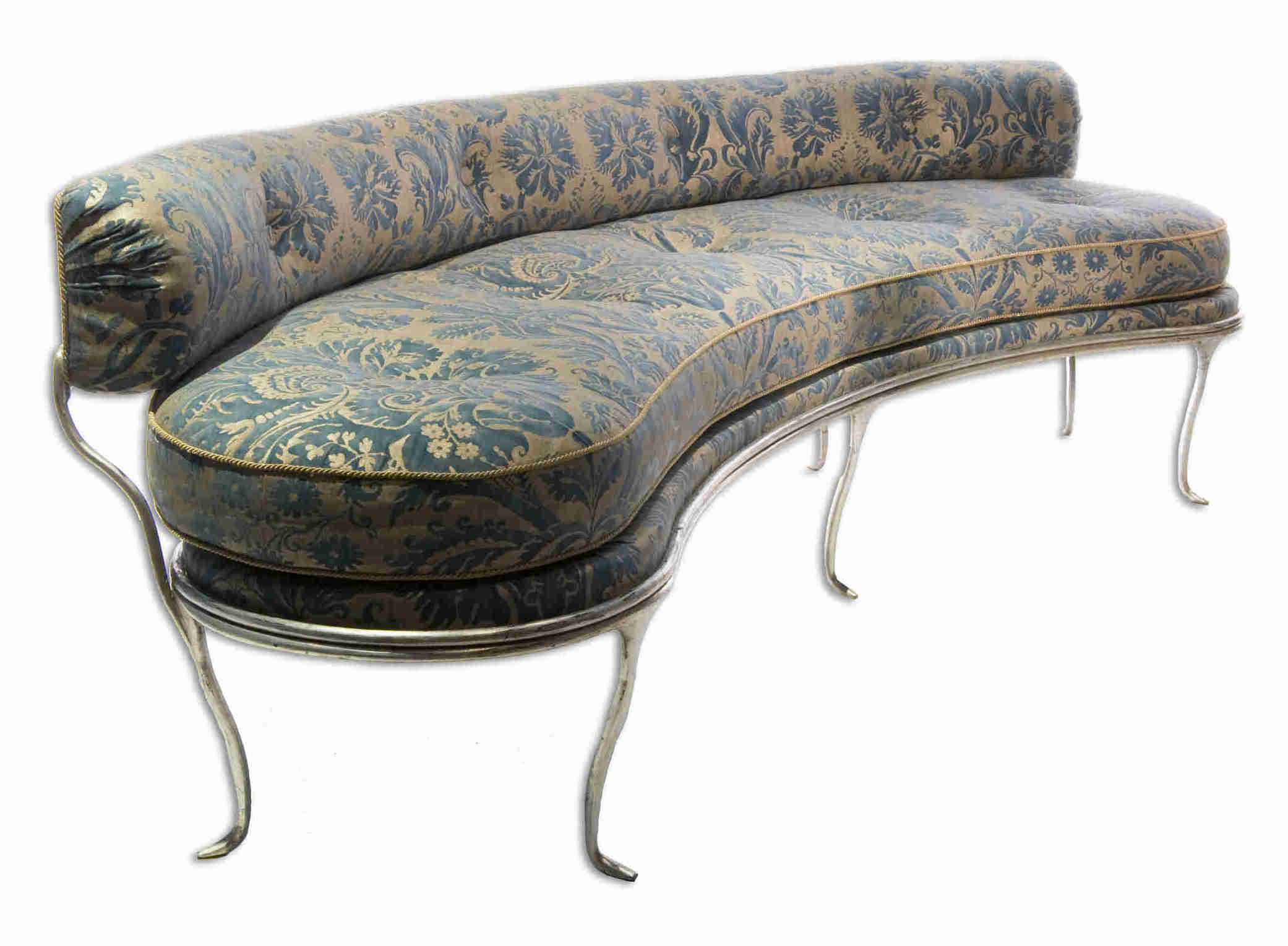Measurements: 90" x 22" x 26"Steel with silver leaf and handprinted Fortuny fabric. Designed as an alternative for seating around an oval dinning table.
